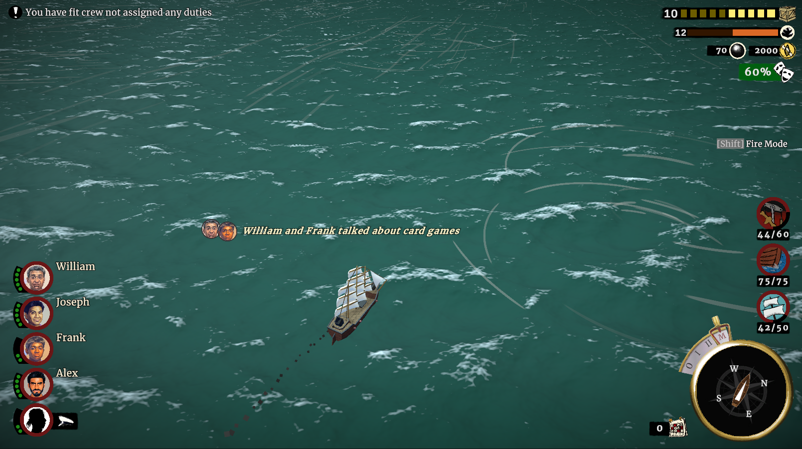 Hire crew to trim the sails, man the guns and cook questionable meals in the galley. Over time the player learns more about each crew member.